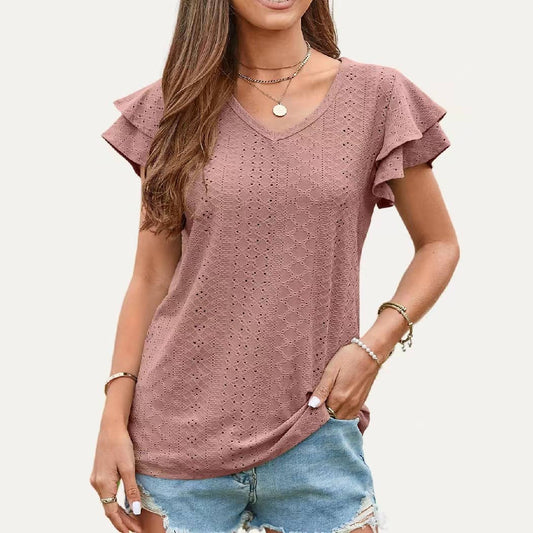 Mesh Ruffled Sleeve Slim Fit V Neck Top